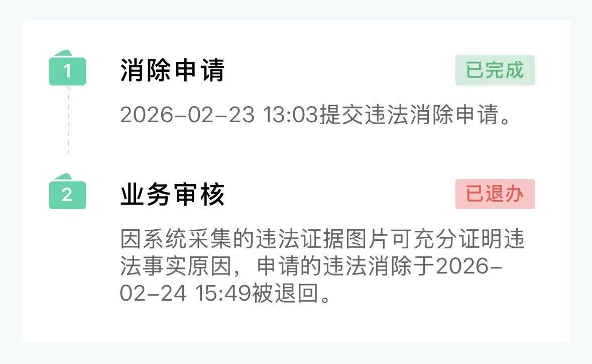 2月23日在12123平台上申请陈述和申辩,2月24日“因系统采集的违法证据图片可充分证明违法事实原因”被退回。