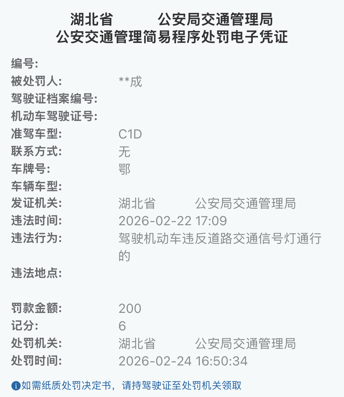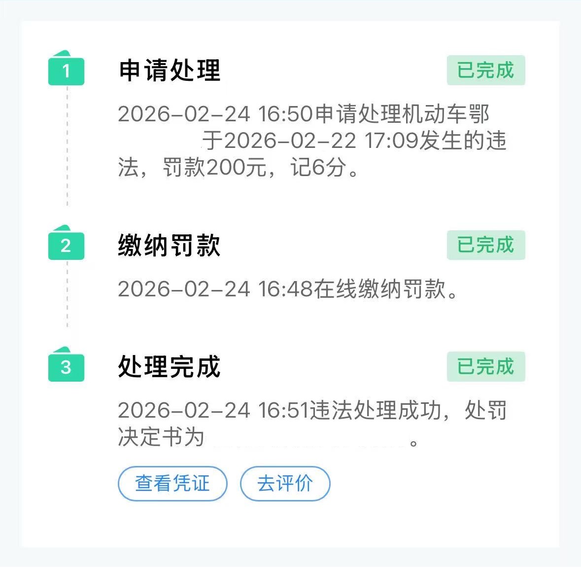 为获取行政处罚决定书,2月24日通过交管12123平台处理该违法行为,缴纳200元罚款后获得处罚电子凭证。