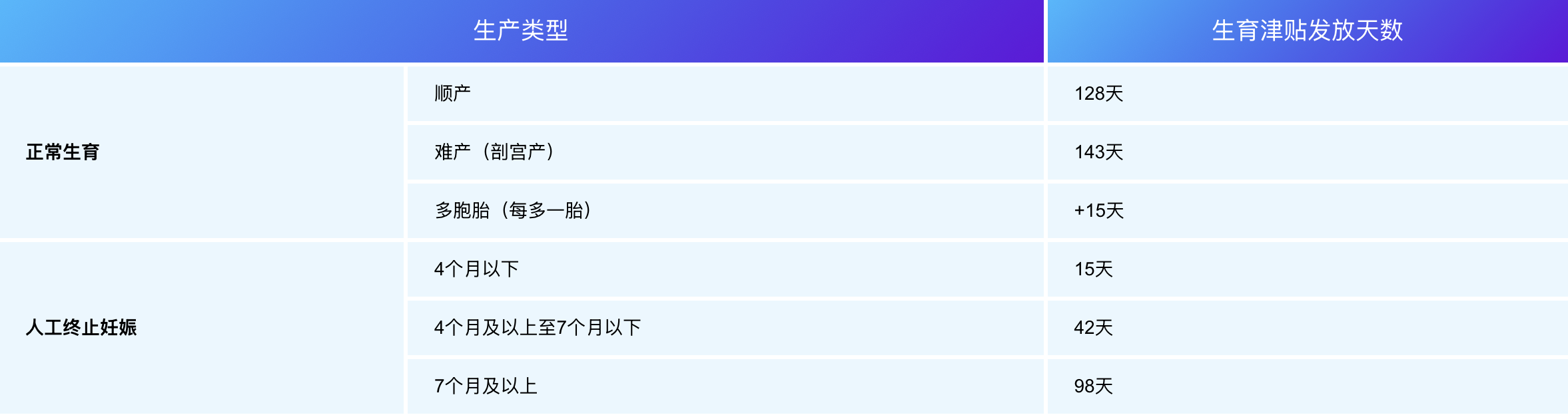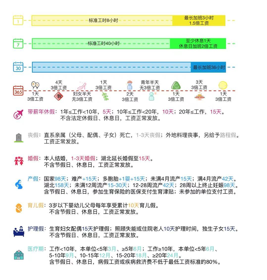 为了促进人口长期均衡发展和维护女职工的合法权益,各地制定了延长产假、设立护理假和育儿假的地方性法规或地方政府规章,以湖北省为例,根据《湖北省人口与计划生育条例》《省卫生健康委办公室关于印发〈《湖北省人口与计划生育条例》有关问题解答〉的通知》,符合法律法规规定生育的妇女,除享受国家规定的产假外,增加产假60天,共计158天,包含国家法定节假日、休息日;其配偶享受15天护理假、3岁以下婴幼儿父母每人每年享受累计10天育儿假,不含国家法定节假日、休息日、职业假;接受节育手术的,其工作单位应当凭节育手术证明,按有关规定给予假期,并发给假期期间的工资、奖金。婚假、产假、护理假和育儿假视同出勤,工资、奖金照发。对赡养人、扶养人照顾失能或患病住院老年人的,用人单位应当提供便利,并给予每年累计不少于10天的护理时间;对独生子女照顾失能或患病住院老年人的,每年护理时间应当累计不少于15天。护理期间视同出勤,工资、奖金照发。根据《湖北省女职工劳动保护规定》,怀孕未满12周流产的,用人单位应当根据其指定医疗机构的证明和其他相关规定,给予15至30天的产假;怀孕12周以上28周以下流产的,给予42天的产假;怀孕28周以上早产的,视为正常分娩,享受98天产假;超期分娩的,视为正常分娩,享受158天产假。